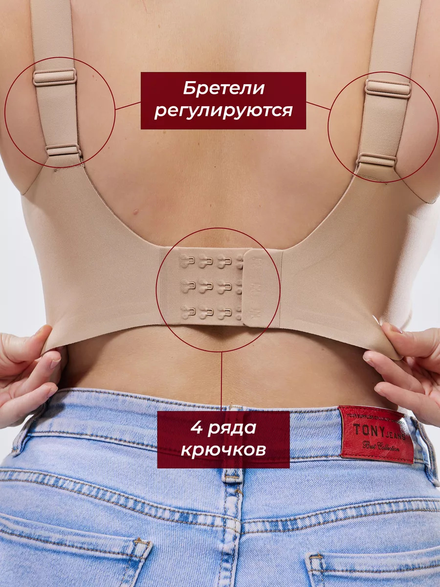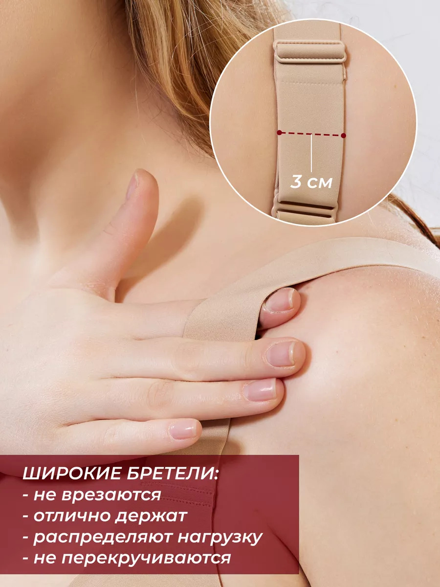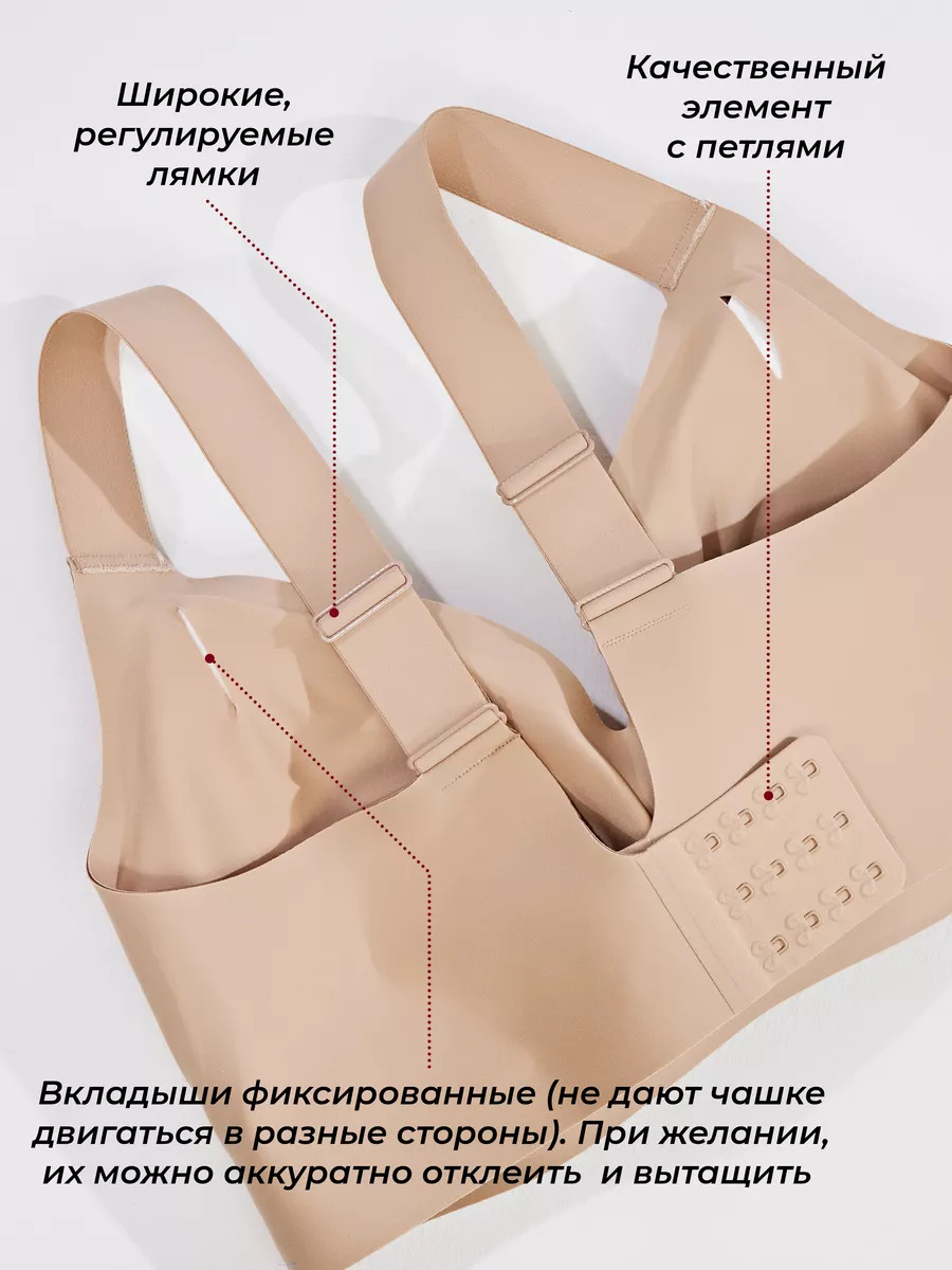 Features: Push-up, seamless, breathable, shaping, sweat-wicking, comfortable, side-bust control, creates a smaller bust appearance